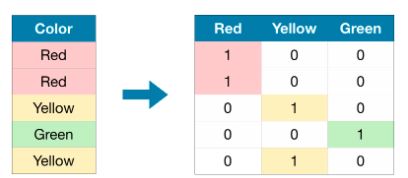One-Hot Encoding이 Label Encoding과 다른 점은, 카테고리를 숫자로 바꾸는 과정에 순서order가 강조되지 않는다는 점이다. 만약 빨강을 0으로 노랑을 1로 바꾸는 Label Encoding 이라면 값을 다루면서 마치 빨강이 노랑보다 덜 중요하다는 뜻으로 해석 될 여지가 있다. 그러나 색깔에는 우위가 없다.